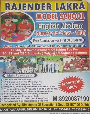 Rajender Lakra Model School (RLM), Bakhtawarpur, Delhi is accepting admissions from 4th Decemeber 2025, following the official admission schedule released by the DoE. The last date to apply for admission in Rajender Lakra Model School (RLM), Bakhtawarpur, Delhi is 27th December 2025.